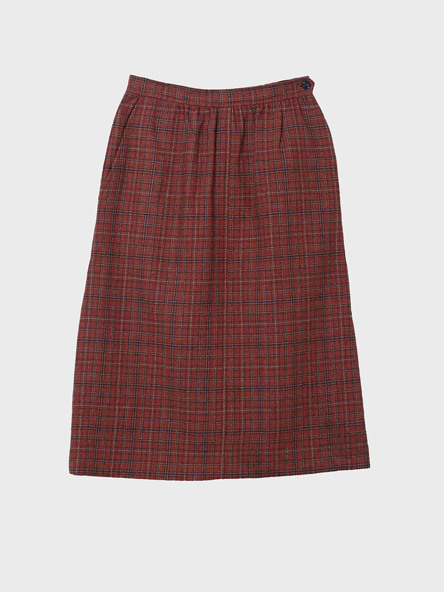1980s Mineral-red A-line skirt with dense dotted-line grid. Fitted with gathers around the waist and pockets on both sides, one concealing a side button closure. Fully lined and in clean, beautiful condition with minor repairs to the lining. Label says size 8. Brand: Evan-Picone. Woolmark Label.