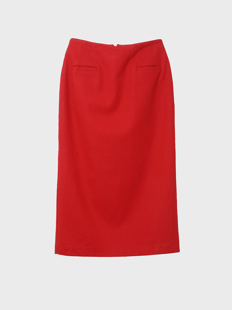 1980s Columnar skirt in solid red flannel. Fitted with darts front and back and smart welt pockets.  Zipper closure and long open kick pleat at center back. Fully lined and in clean, beautiful condition. Label says made in U.S.A., size 10. Brand: Michele