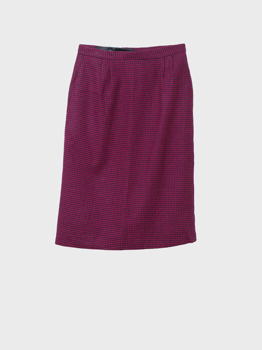 1980s Straight skirt in magenta houndstooth flannel. Fitted with two tucks on either side at the front and concealed side pockets. Zipper closure and kick pleat at center back. Fully lined and in clean, beautiful condition. Label says made in U.S.A., size 8. Woolmark label. Brand: André Barreau.