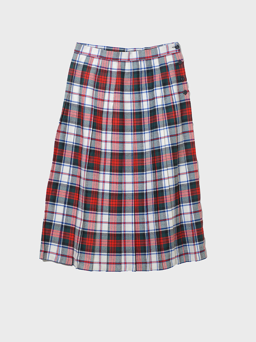 1990s white, red, and green pleated plaid skirt to wear under a sprig of mistletoe. Fitted for movement with precise knife pleats all the way around. Side button closure. Unlined and in clean, beautiful condition save for minor surface repair. Label says made in Great Britain, size 14. Woolmark label.
