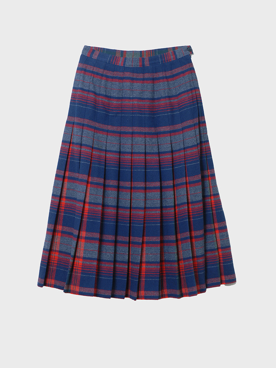 1980s a pleated masterpiece: hazy bands of red and blue open to flashing red inside the pleats. Fitted for movement with precise knife pleats all the way around. Side zipper closure with button. Unlined and in clean, beautiful condition with minor surface repair. Label says made in U.S.A., size 8. Woolmark label.