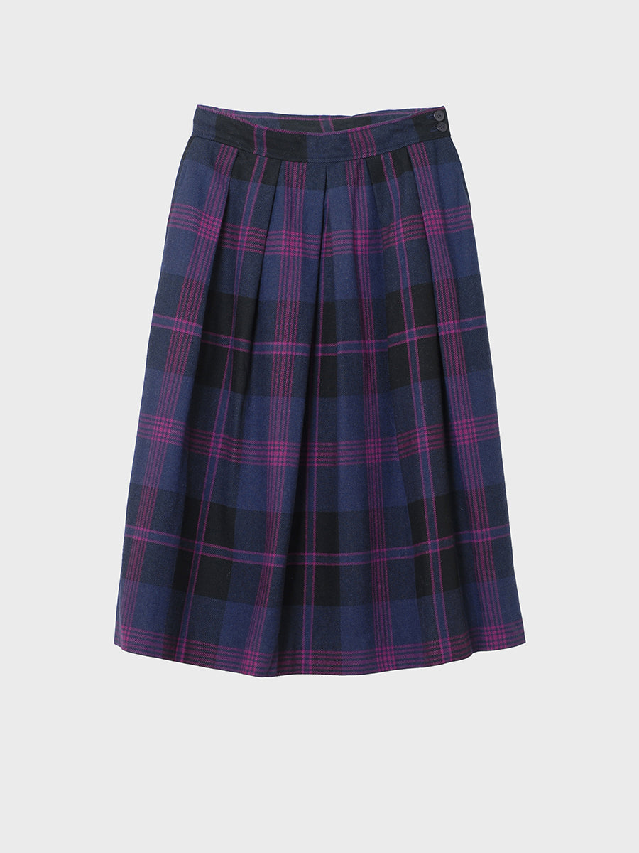 1980s pleated skirt with wide black and blue bands and fuchsia highlights. Fitted with radiating pleats across the front, gathers across the back. Two side pockets, one concealing a button closure. Fully lined and in clean, beautiful condition. Label says size 10. Woolmark label.