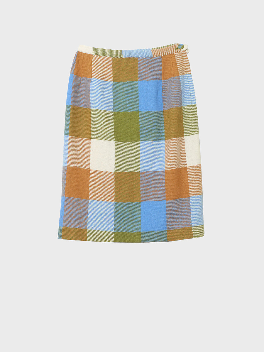 1960s short straight skirt with graphic block pattern combining blue, green, orange, and white. Fitted with two darts on either side, front and back. Side zipper closure with self-finished button. Fully lined and in clean, beautiful condition.