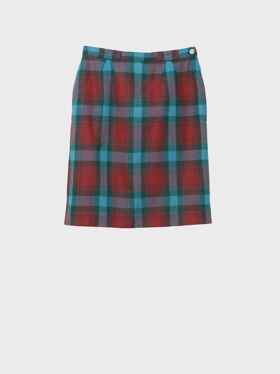 1950s straight skirt with an optical repeat evoking Josef Albers’ Homage to the Square in red, green, and soft robin’s egg blue. In the front, two wide belt loops and distinctive angled darts. In the back, a center belt loop and two darts on either side. Side zipper closure with button. Half-lined in the back and in clean, beautiful condition, save for light discoloration to the lining.