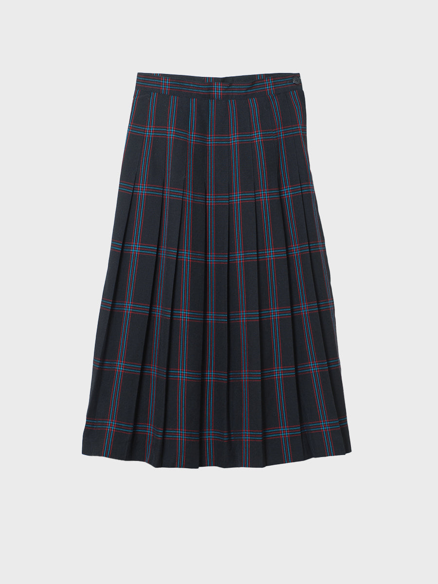 1980s long black plaid skirt with electric pops of red and blue. Fitted for movement with precise knife pleats all the way around. Side zipper closure with button. Fully lined and in clean, beautiful condition. Label says made in U.S.A., petite size 10. Woolmark label.