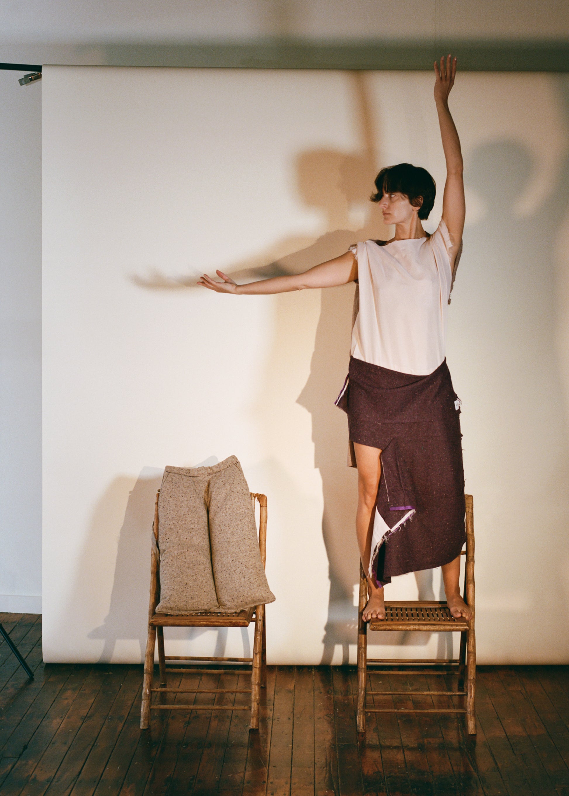 “Two wool skirts were sewn together. My intention was not to disrupt how Audrey left the skirts. Rather, I wanted to keep them as close to their original form as possible, allowing the materials to play and become one through draping on the body.” Emma Larimer