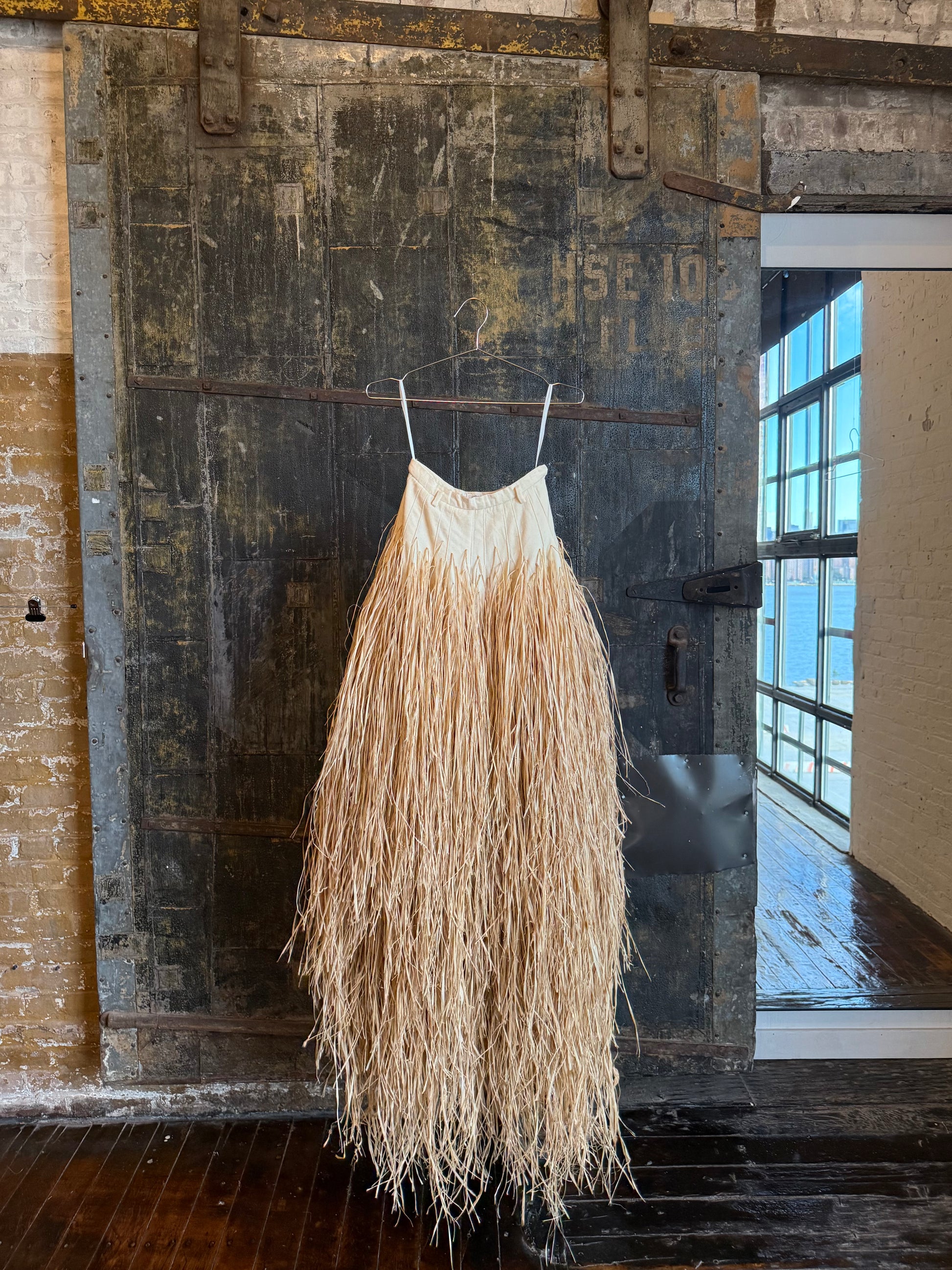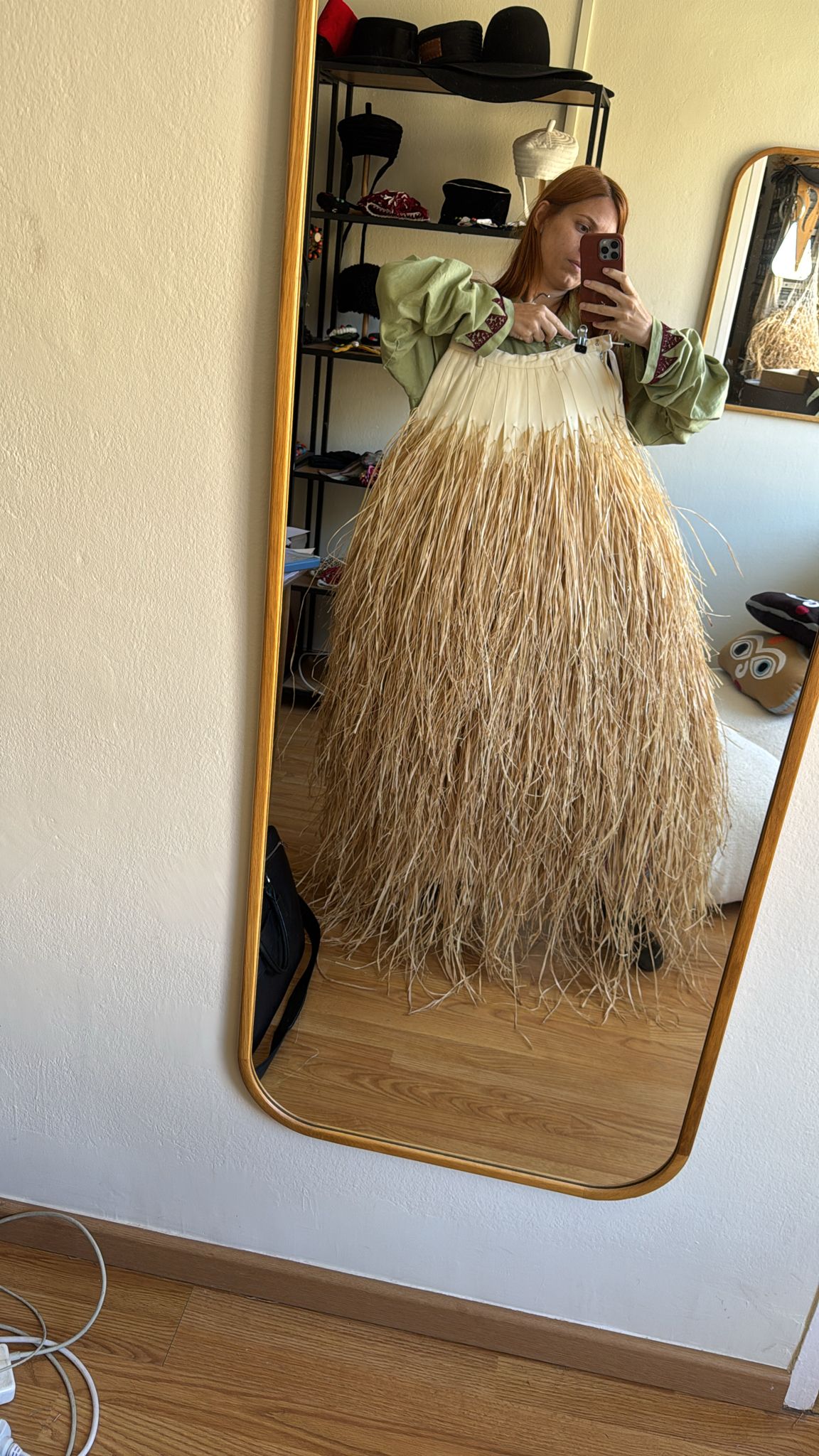 "In this work, the concept of revisiting the beginnings of this type of skirt is presented, exploring the years of morphological changes and generating thoughts on origins through simple materials like straw and knots." Sol Pardo
