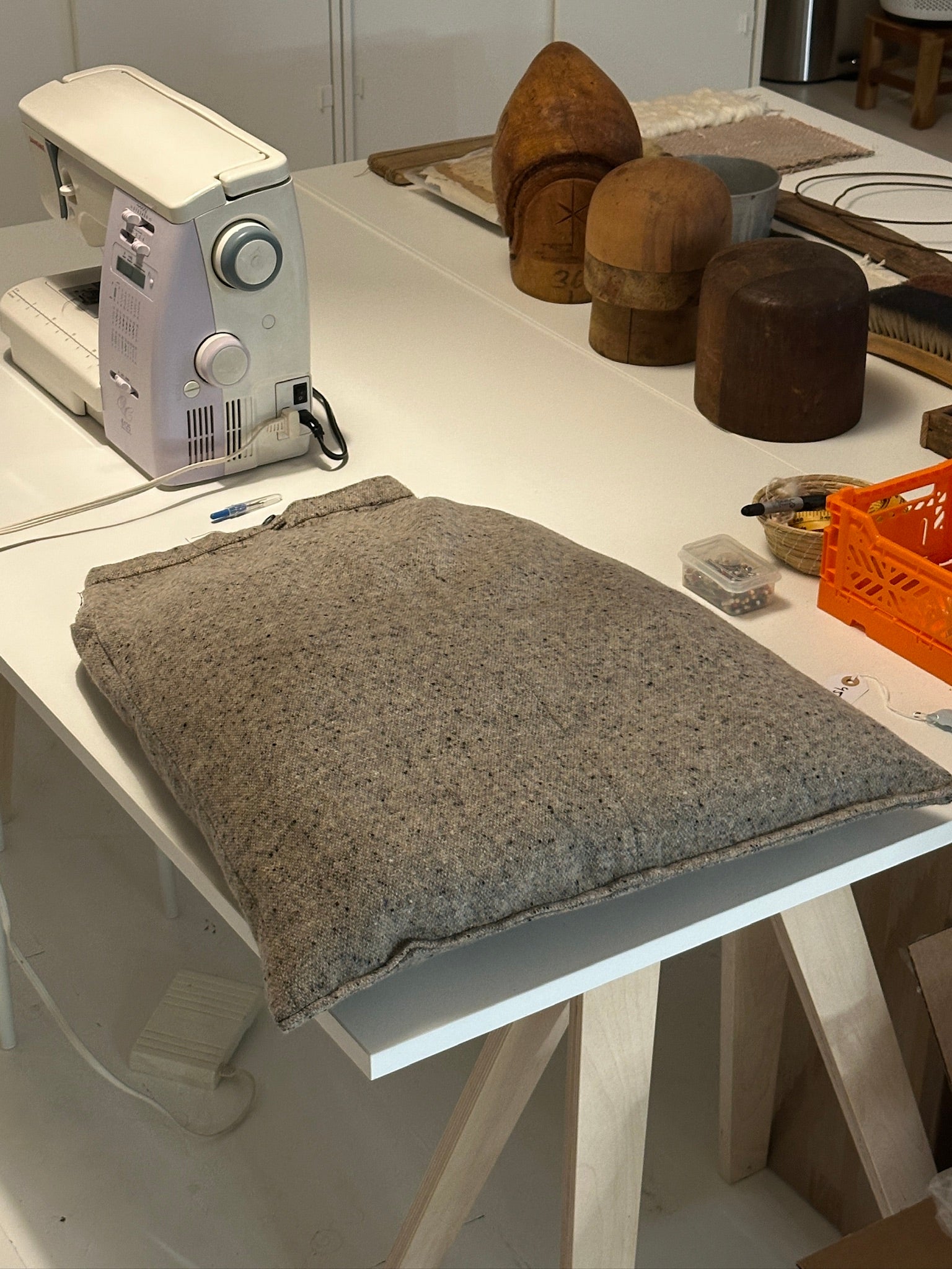 MATERIALS: Wool skirt, raw wool, metal grommets, found fabric